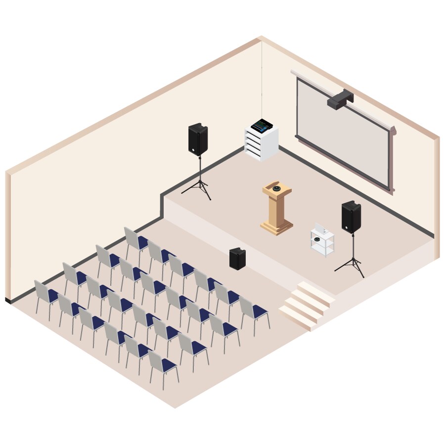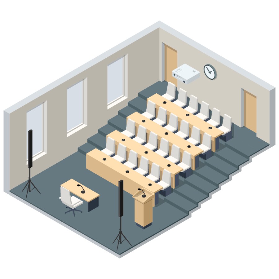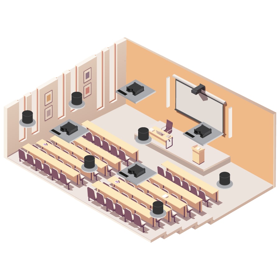 A Lecture Hall requires a custom solution - something with enhanced performance over a greater area. All students should be able to hear, and to contribute where needed. This example combines Yamaha's ADECIA ceiling microphones along with advanced processing, and an expanded speaker system to cover all areas of the lecture theatre. The system caters for voicelift and program audio without the need for additional hardware. All this functionality can be easily controlled from a tablet interface.