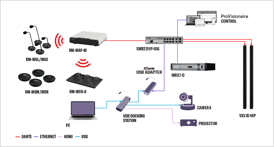 A larger space calls for a flexible and expandable system - all the tools that you need to create a custom solution for any size of venue. Here we have combined the ADECIA solution with the DM3 audio mixer, and some simple automation. The use of Dante networked audio means that it's incredibly easy to reconfigure your system for different events - or to scale up to include additional speakers or microphones. The speaker system provides you with room-filling sound, whether you're making a presentation, playing back media, or presenting a live performance of music or theatre.