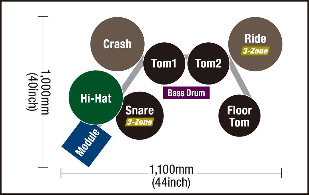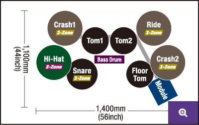 - Pad a 3 zone per rullante e ride. I piatti possono essere stoppati con la mano. Il ride è dotato di una funzione di rilevamento della posizione del punto colpito (positional sensing)