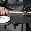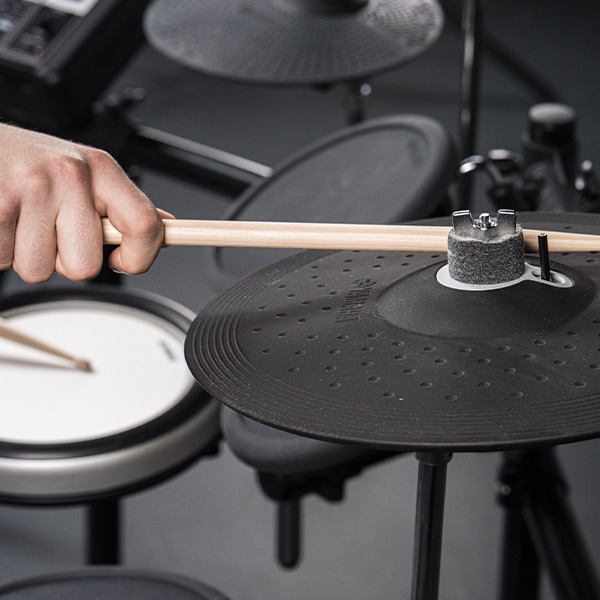 - Pad a 3 zone per rullante e ride. I piatti possono essere stoppati con la mano. Il ride è dotato di una funzione di rilevamento della posizione del punto colpito (positional sensing)