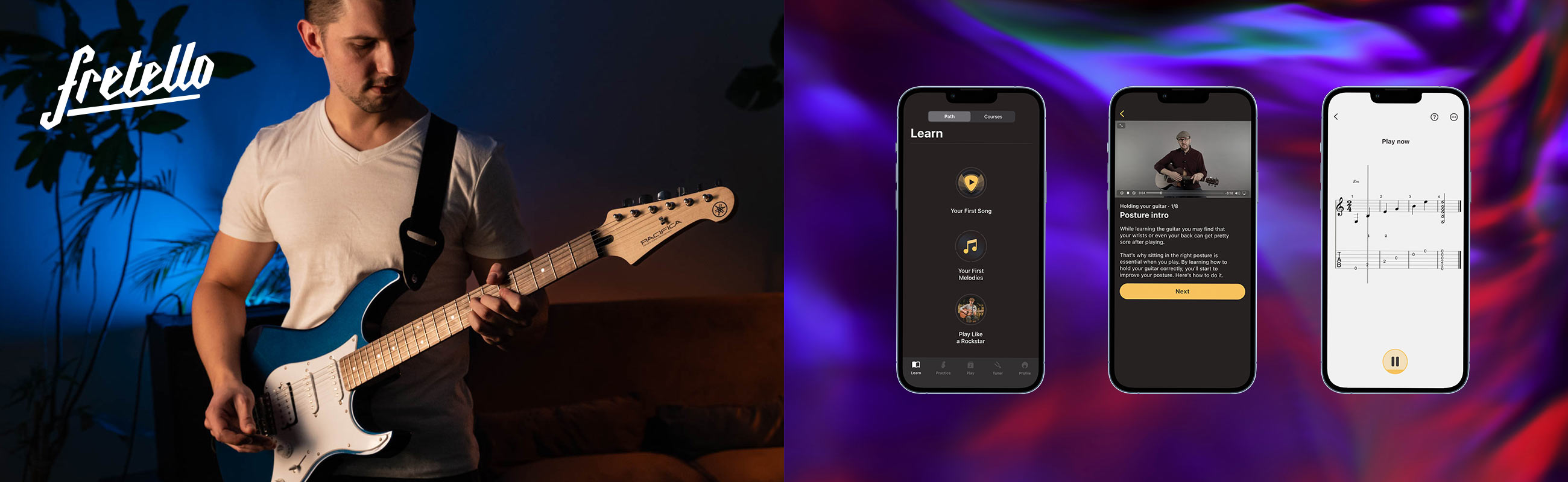 Fretello è un'app progettata da professionisti, che insegna passo-passo a suonare la chitarra. Offre una serie di video corsi strutturati pensati per aiutarti a padroneggiare lo strumento.