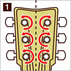 1. Before restringing the guitar, first confirm the direction to turn the pegs. The pegs for strings 1 through 3 are typically turned clockwise when looking from the front, while those for strings 4 through 6 are turned counterclockwise.