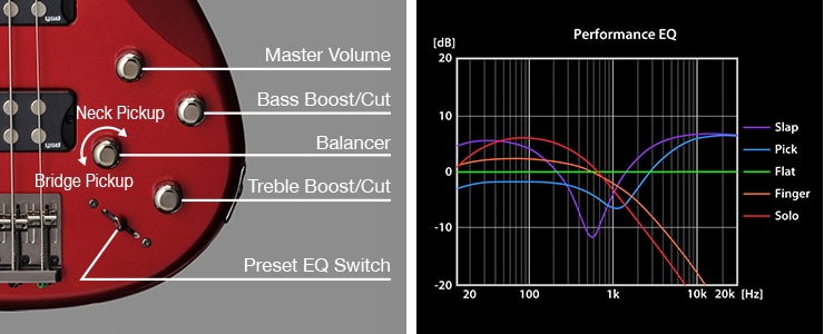- 2-band active EQ with 5-way Performance EQ preset switch