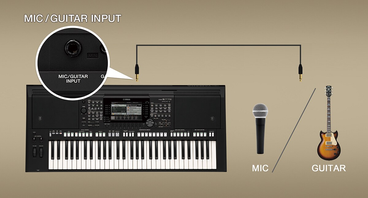 La PSR-S775 è dotata di un input Mic/Guitar che consente di aggiungere agevolmente voci o una chitarra alla tua performance live. E’ sufficiente collegare un microfono e assegnare facilmente alla voce uno dei versatili effetti della PSR. Oppure collegare una chitarra e regolare i parametri secondo il proprio gusto ed emulare il suono del proprio artista preferito, o creare un suono del tutto personale!