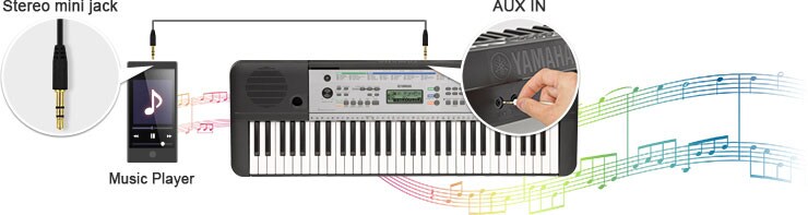 Collega il tuo lettore audio al modello YPT-255 per ascoltare o suonare la tua musica preferita utilizzando gli altoparlanti dello strumento.