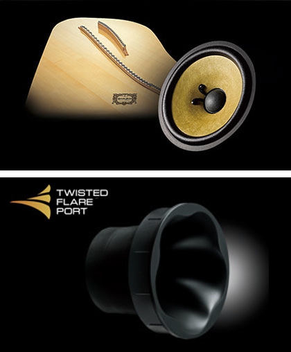 La Twisted Flare Port, una nuova tecnologia Yamaha, offre un suono più chiaro nelle frequenze basse. La forma svasata e leggermente attorcigliata diffonde uniformemente il flusso d'aria attraverso l'uscita. Comparata ad un'uscita tradizionale, la Twisted Flare Port riduce il rumore di fondo provocato dall'aria, contribuendo alla riproduzione chiara e accurata delle basse frequenze.