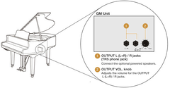 - Le connessioni di uscita dell'altoparlante sono state aggiunte all'unità GM, installata sotto la sezione tenore dei pianoforti di tipo SH. Collegando gli altoparlanti dotati di amplificatori incorporati a questi terminali di uscita, le prestazioni effettuate in modalità "Silent" possono ora essere udite attraverso gli altoparlanti.