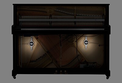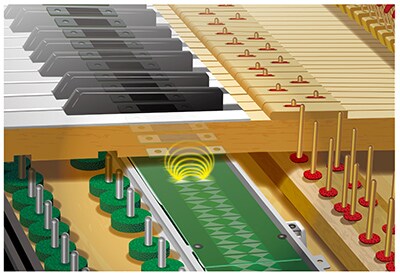 Yamaha has developed a new transducer exclusively for compact upright pianos. The transducer converts digital sound information into vibrations and delivers them to the soundboard, which in turn vibrates and joins the resonance of the strings to turn the entire piano into a resonator. Digital sound sources can be used to produce natural acoustic sound from the body of the piano, making it possible to control the volume when playing without the need for headphones.