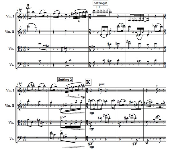 String Quartet No. 2 For AFC System consisted of two distinct sections: a slow part representing the image of a mountain and a fast part representing the image of a desert. The music alternated between these two sections, culminating in a climax where they merged, reminiscent of a sci-fi film