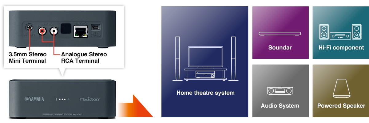 Grazie alle sue uscite stereo RCA e mini-jack, WXAD-10 può essere collegato a un gran numero di dispositivi audio, compresi quelli già presenti in casa. Abbinatelo a un impianto Hi-Fi, un sistema audio compatto, un impianto Home Theatre o anche a una soundbar. Le possibilità sono infinite.