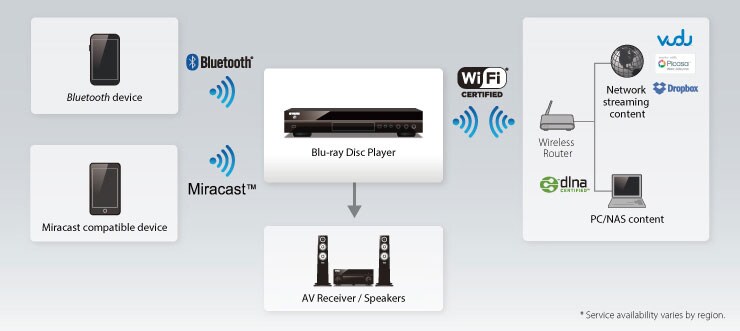 Questo lettore Blu-ray Disc è compatibile con Miracast™, uno standard wireless che permette di connettere qualsiasi dispositivosmartphone o tablet compatibile Miracast™ per effettuare il mirroring di video e foto al lettore, affinchè l'intera famiglia possa vedere tale contenuto sullo schermo TV. Utilizzando un sintoamplificatore Yamaha AV, potrete vedere e ascoltare numerose sorgenti trasmesse via Miracast™ con un suono estremamente dinamico.