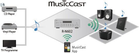 MusicCast utilizza una connessione wireless ad elevate prestazioni per riprodurre musica e altri contenuti audio. Effettua lo streaming della musica digitale da smartphone, PC o NAS ad altri dispositivi MusicCast presenti in casa. Può inoltre condividere l'audio di dispositivi esterni come TV o lettori CD connessi al sintoamplificatore R-N602. Anche i contenuti audio ricevuti via Bluetooth da smartphone o tablet possono essere inviati in streaming ai dispositivi MusicCast presenti nelle varie stanze.