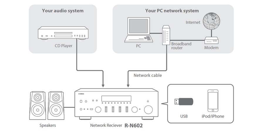 R-N602 è un sintoamplificatore stereo e un lettore di rete. Può essere utilizzato per riprodurre le sorgenti audio presenti nel PC o NAS. Potete anche ascoltare la musica dei servizi streaming e dalla radio internet (vTuner). Inoltre, l'app Yamahal MusicCast permette di ascoltare la vostra musica preferita da smartphone o tablet con connessione wireless.