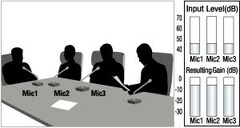Quando una persona sta parlando il guadagno del microfono corrispondente viene portato a 0 dB mentre il guadagno degli altri due microfoni viene abbassato. Quando sta parlando solo una persona succede lo stesso agli altri canali.