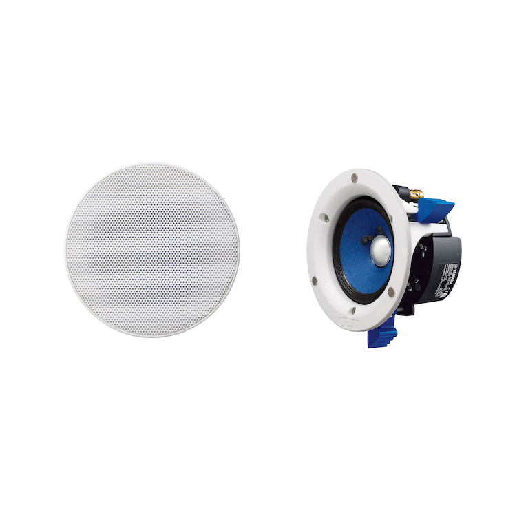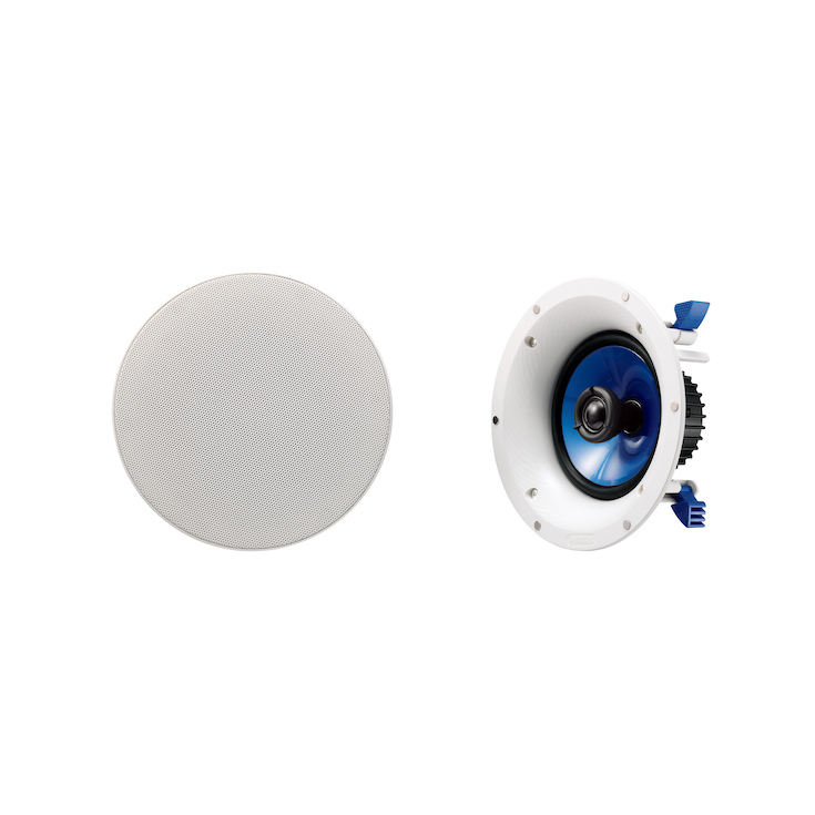 Diffusore coassiale da incasso da 6-1/2" dotato di cono woofer, di tweeter orientabile con cupola morbida a raffreddamento liquido, di 110W di tenuta in potenza, di deflettore acustico a tromba e di una griglia sottile e leggera
