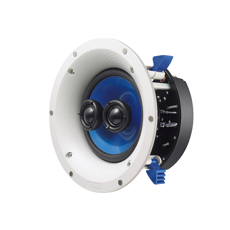 Diffusore coassiale da incasso da 6-1/2" dotato di cono woofer a doppia bobina mobile, di due tweeter orientabili con cupola morbida a raffreddamento liquido, di 120W di tenuta in potenza, di deflettore acustico a tromba e di una griglia sottile e leggera